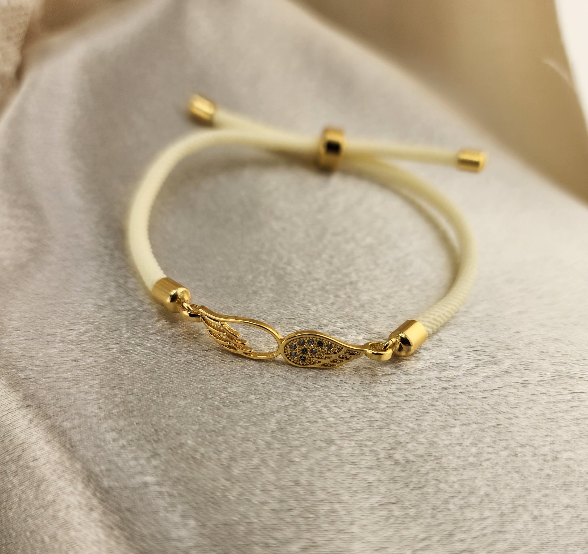 Un delicado brazalete con alas en baño de oro, incrustado con zirconias brillantes y cordón suave ajustable. Ligero, elegante y lleno de significado — ideal para celebrar la amistad y la fuerza dulce que te acompaña cada día.